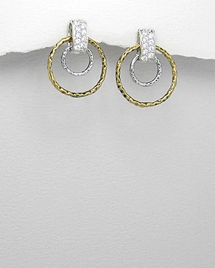 Náušnice zo striebra 925. Náušnice sú zdobené zirkónmi. Povrch náušníc je porodiovaný, pozlátená časť je pozlátená 14k žltým zlatom. Náušnice majú zapínanie na puzetky. Priemer pozlátených krúžkov 18mm.