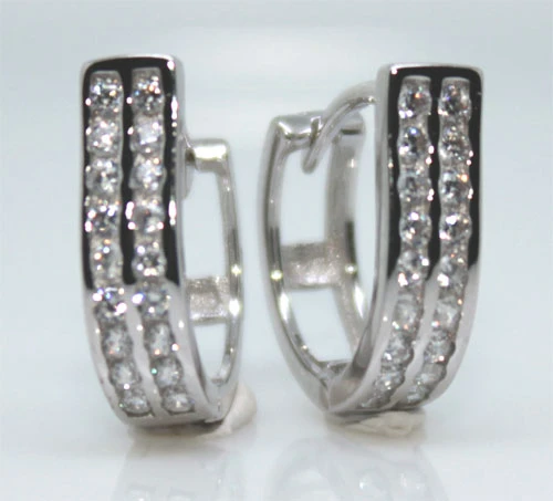 Dámske náušnice so zirkónmi vyrobené zo striebra 925/000. Náušnice majú porhodiovaný povrch. Nanesenej ródium dodáva naušnicím jasnú farbu a lesk. Rozmer náušníc 14x4x14mm. Náušnicové zapínanie má priemer 11mm.