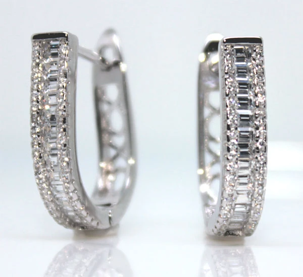 Dámske náušnice so zirkónmi vyrobené zo striebra 925/000. Náušnice majú porhodiovaný povrch. Nanesenej ródium dodáva naušnicím jasnú farbu a lesk. Rozmer náušníc 21x4x14mm. Náušnicové zapínanie má rozmer 15x10mm.