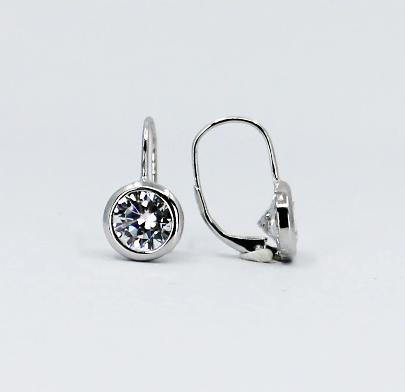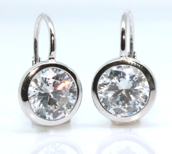 Strieborné náušnice so zirkónmi. Povrch náušníc je porhodiovaný. Povrch upravený rhodiom má jasnú farbu a lesk. Ródium súčasne zamedzuje prirodzené oxidácii striebra. Zirkóny majú priemer 8mm, celkový rozmer náušnice 18x10mm, rozmer náušnicového zapínanie 15x9mm.