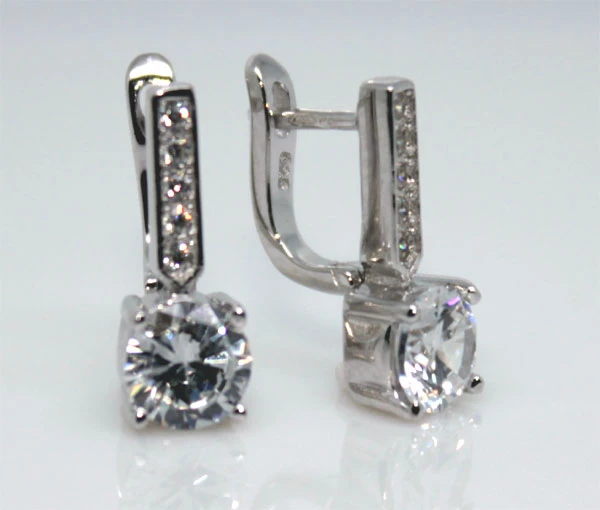 Strieborné náušnice so zirkónmi. Povrch náušníc je porhodiovaný. Povrch upravený rhodiom má jasnú farbu a lesk. Ródium súčasne zamedzuje prirodzené oxidácii striebra. Ozdoba s bielym kamienkom má priemer 6mm, rozmer náušníc 15x6mm, rozmer zapínanie 6x5mm.