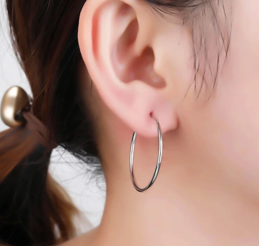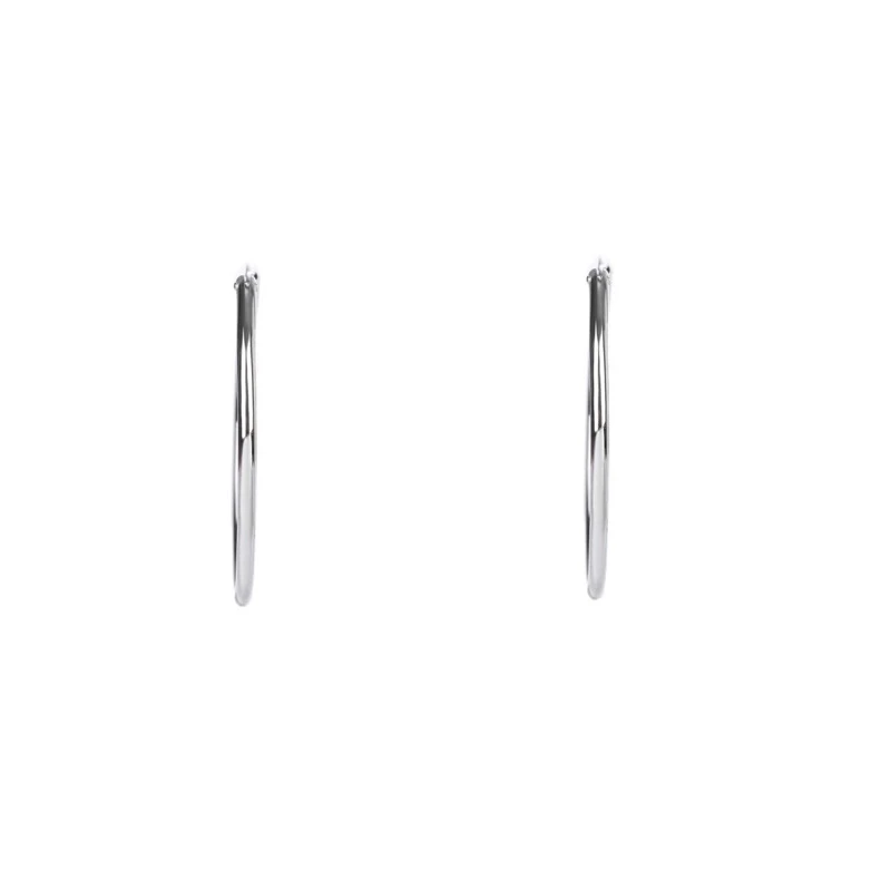 Okrúhle náušnice zo striebra 925/1000. Povrch náušníc je pokovovaný ródiom. Úprava ródiom dodáva náušniciam žiarivú farbu s leskom, zvyšuje odolnosť povrchu proti poškriabaniu a zaručuje dlhotrvajúci bezchybný vzhľad. Náušnice sú široké 1,6 mm, vonkajší priemer je 40 mm.