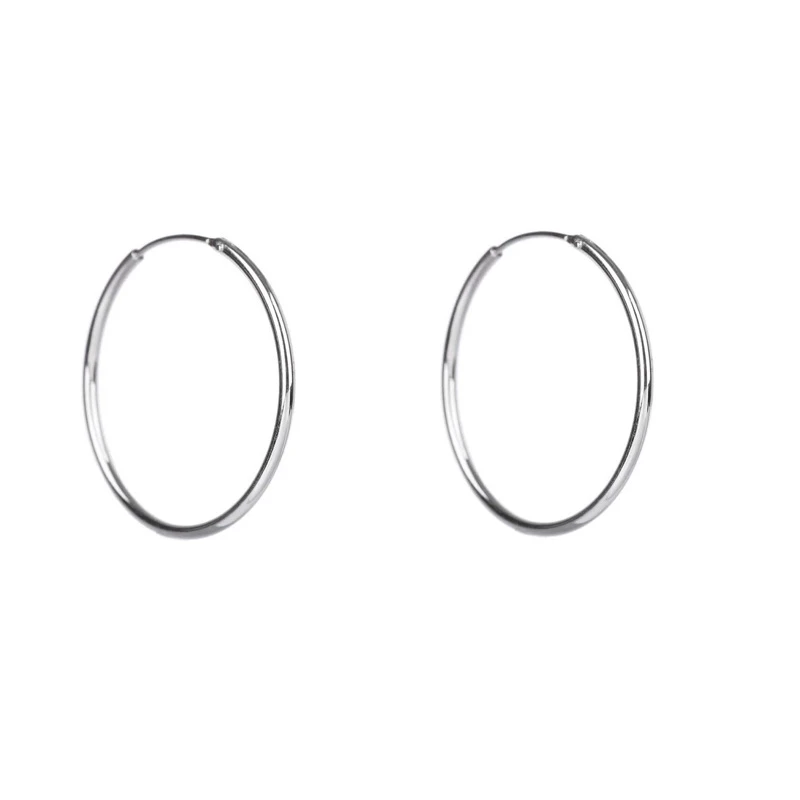 Okrúhle náušnice zo striebra 925/1000. Povrch náušníc je pokovovaný ródiom. Úprava ródiom dodáva náušniciam žiarivú farbu s leskom, zvyšuje odolnosť povrchu proti poškriabaniu a zaručuje dlhotrvajúci bezchybný vzhľad. Náušnice sú široké 1,6 mm, vonkajší priemer je 50 mm.