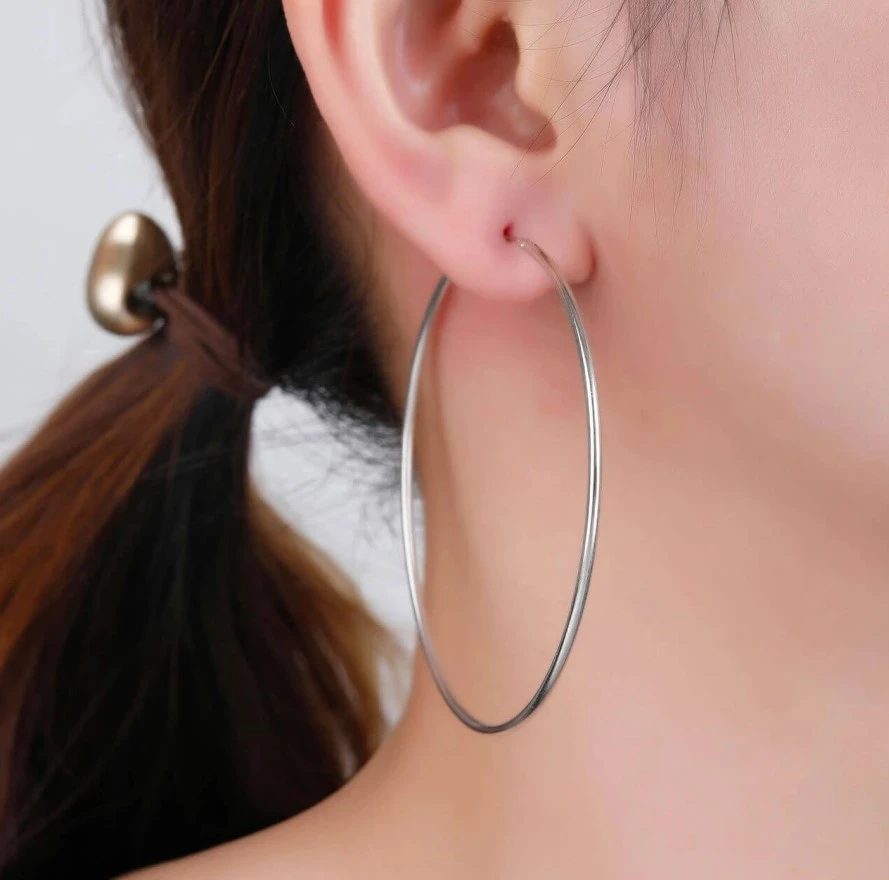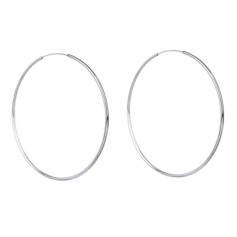 Okrúhle náušnice zo striebra 925/1000. Povrch náušníc je pokovovaný ródiom. Úprava ródiom dodáva náušniciam žiarivú farbu s leskom, zvyšuje odolnosť povrchu proti poškriabaniu a zaručuje dlhotrvajúci bezchybný vzhľad. Náušnice sú široké 1,6 mm, vonkajší priemer je 70 mm.