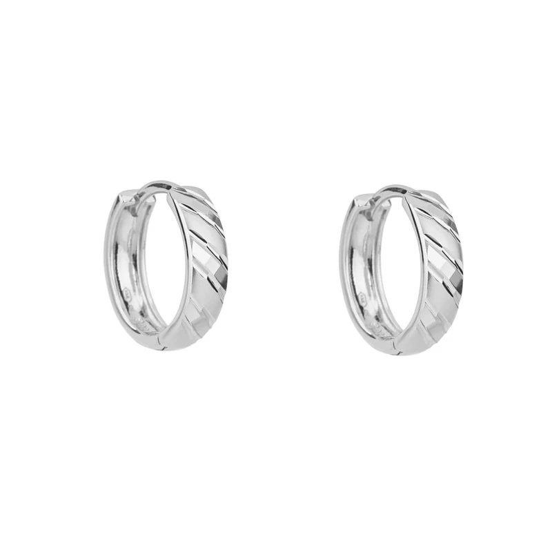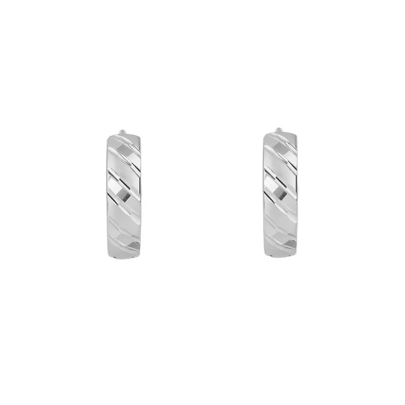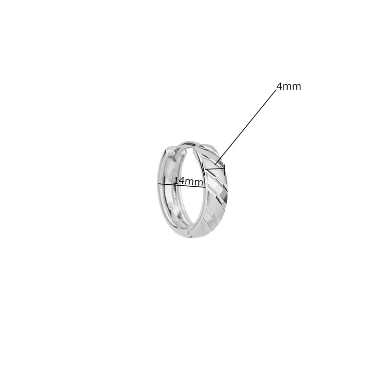 Náušnice krúžky vyrobené z kvalitného striebra 925/1000. Povrch náušníc je kombinácia mat/lesk. Náušnice sú navyše porhodiované, čo im dodáva jasnú farbu s leskom, potláča prirodzenú oxidáciu striebra, zvyšuje odolnosť povrchu proti poškriabaniu a zaručuje dlhodobý bezchybný vzhľad náušníc. Náušnice sú široké 4mm, vonkajší priemer náušníc 14 mm. Náušnicové zapínanie je kĺbové.