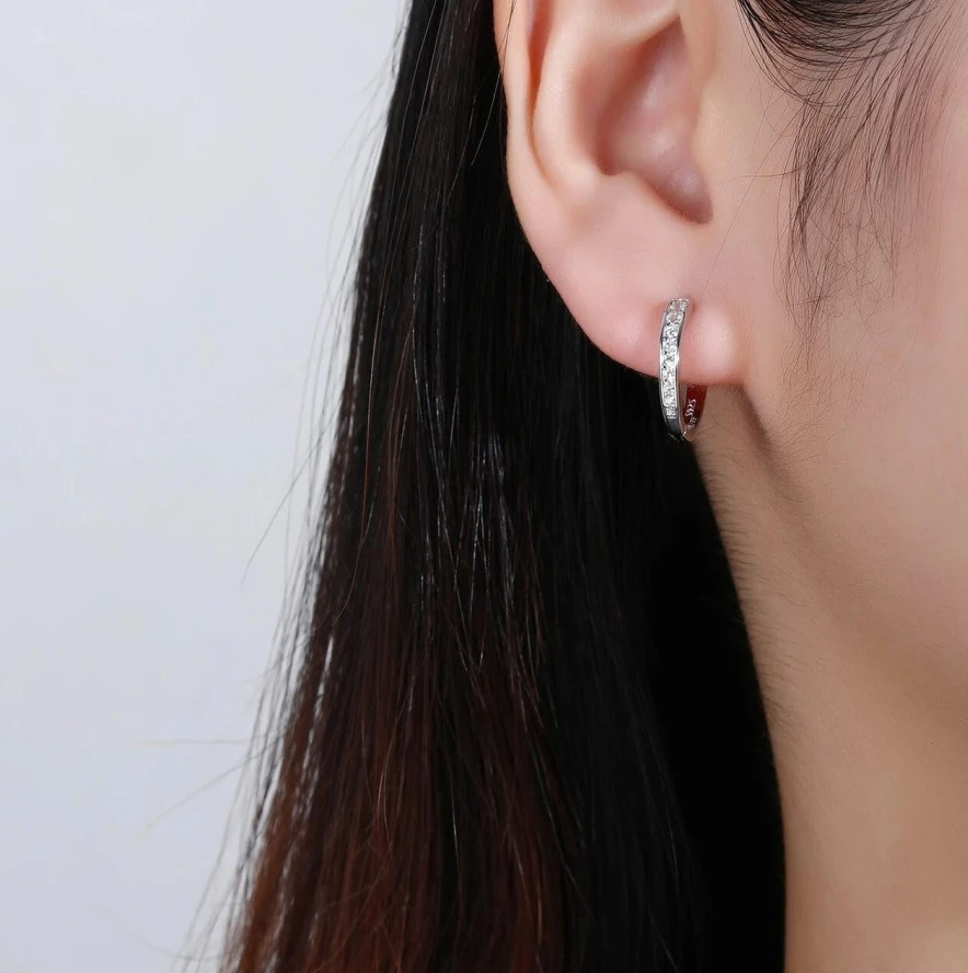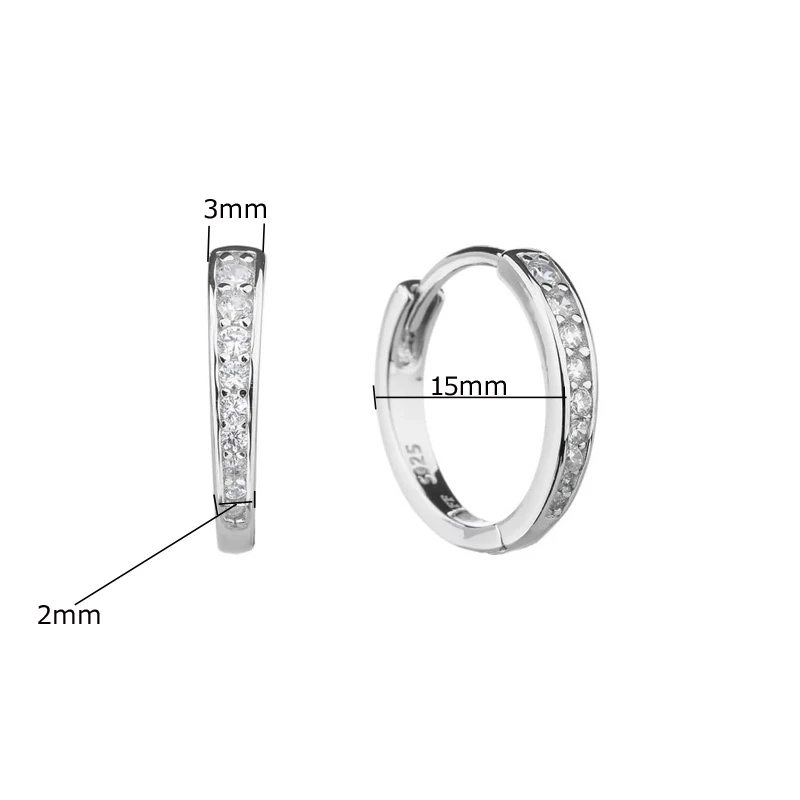 Náušnice krúžky vyrobené z kvalitného striebra 925/1000. Náušnice sú osadené prvotriednymi zirkónmi. Povrch náušníc je porhodiovaný, čo im dodáva jasnú farbu s leskom, potláča prirodzenú oxidáciu striebra, zvyšuje odolnosť povrchu proti poškriabaniu a zaručuje dlhodobý bezchybný vzhľad náušníc. Náušnice sú široké 2-3mm, vonkajší priemer náušníc 15 mm. Náušnicové zapínanie je kĺbové.