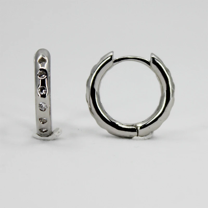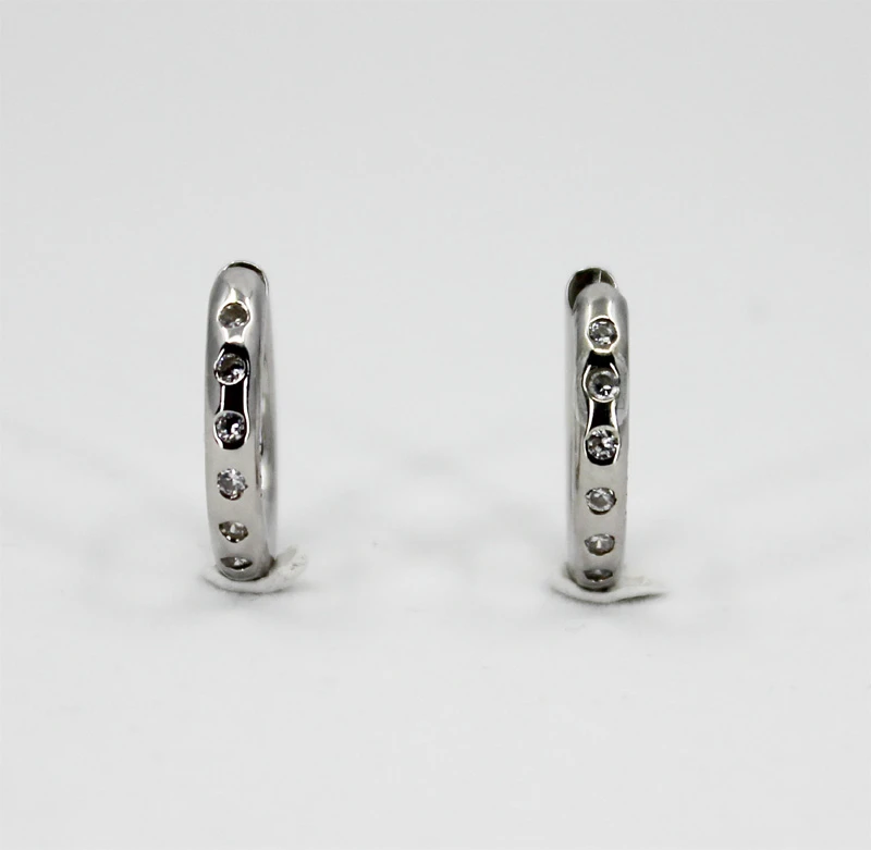 Náušnice krúžky vyrobené z kvalitného striebra 925/1000. Náušnice sú osadené prvotriednymi zirkónmi. Povrch náušníc je porhodiovaný, čo im dodáva jasnú farbu s leskom, potláča prirodzenú oxidáciu striebra, zvyšuje odolnosť povrchu proti poškriabaniu a zaručuje dlhodobý bezchybný vzhľad náušníc. Náušnice sú široké 3mm, vonkajší priemer náušníc 18mm. Náušnicové zapínanie je kĺbové.