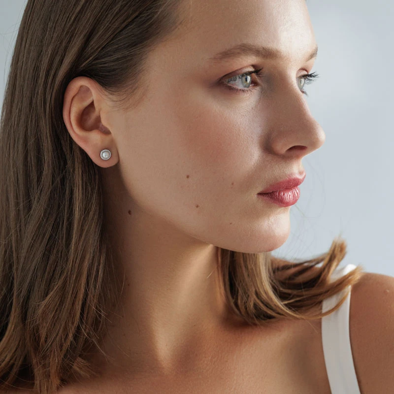 Strieborné náušnice kôstky zdobené sladkovodnými perlami a žiarivými zirkónmi. Náušnice sú vyrobené zo striebra rýdzosti 925/1000. Povrch náušníc je porhodiovaný, nanesené ródium dodáva náušniciam jasnú farbu s leskom, chráni povrch náušníc proti poškriabaniu a zamedzuje prirodzenej oxidácii striebra, náušnice tak budú mať dlhú dobu bezchybný vzhľad. Náušnicové zapínanie je na puzetky. Náušnice majú priemer 7 mm, samotné sladkovodné perly majú priemer 4 mm.