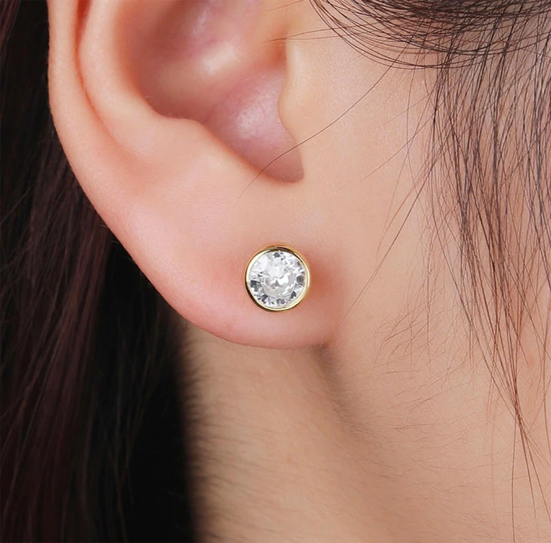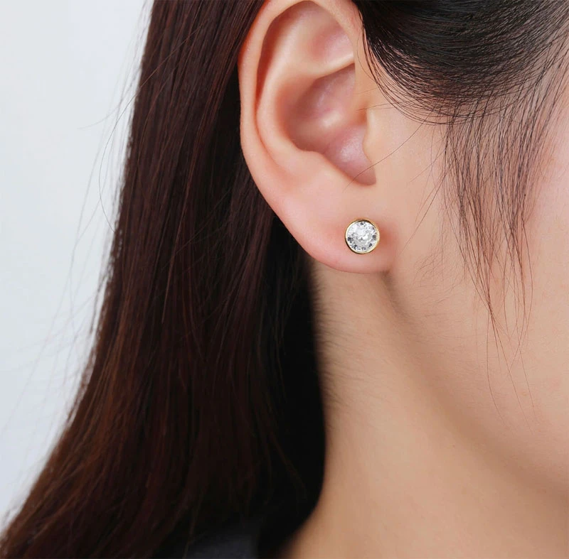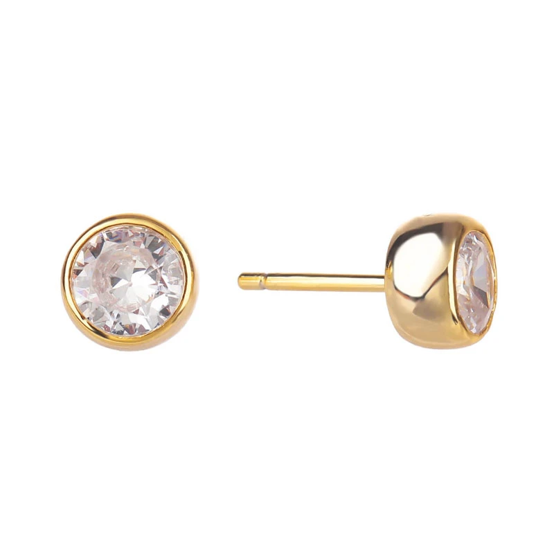 Náušnice kôstky so zirkónmi vyrobené zo striebra rýdzosti 925/1000. Náušnice sú pozlátené žltým 14k zlatom. Priemer náušníc 7mm. Náušnicové zapínanie je na puzetky.