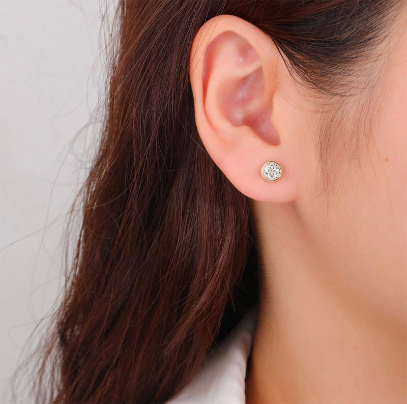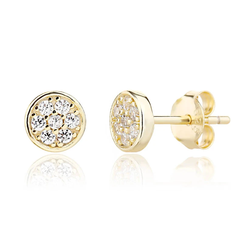 Náušnice kôstky so zirkónmi vyrobené zo striebra rýdzosti 925/1000. Náušnice sú pozlátené žltým 14k zlatom. Priemer náušníc 6 mm. Náušnicové zapínanie je na puzetky.