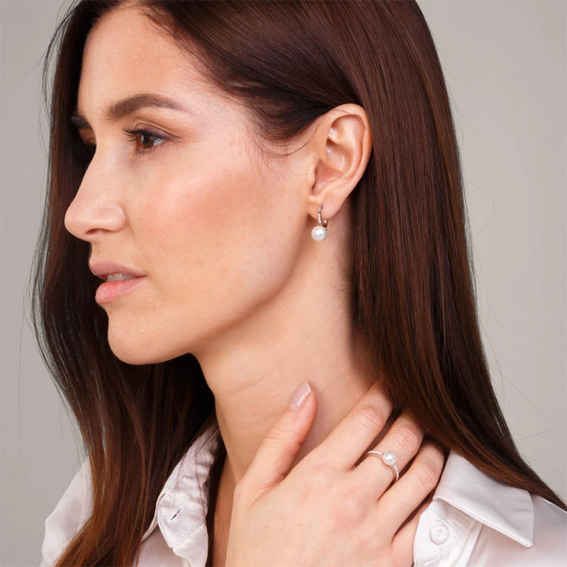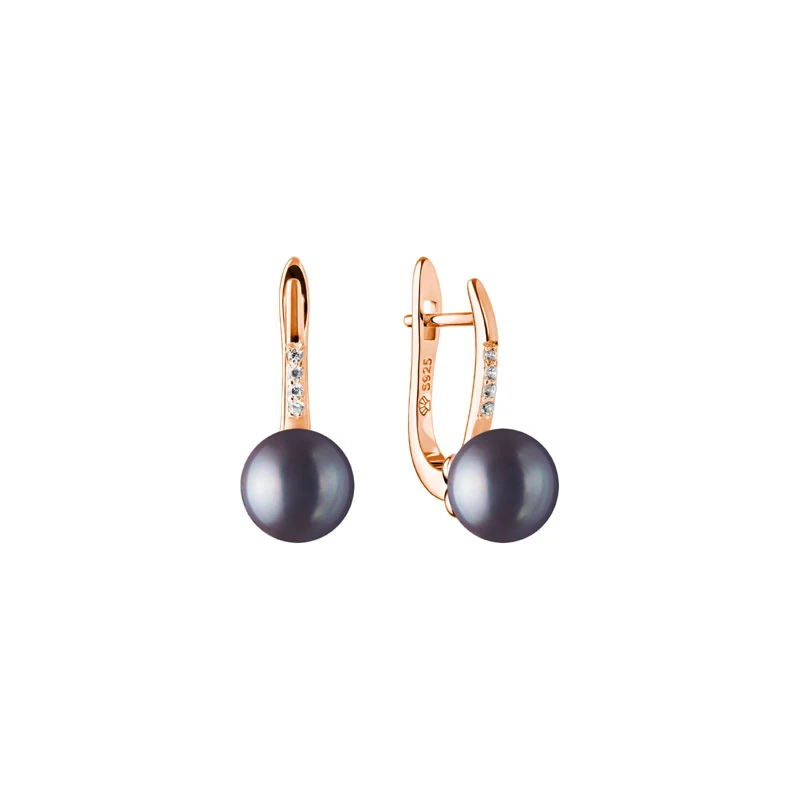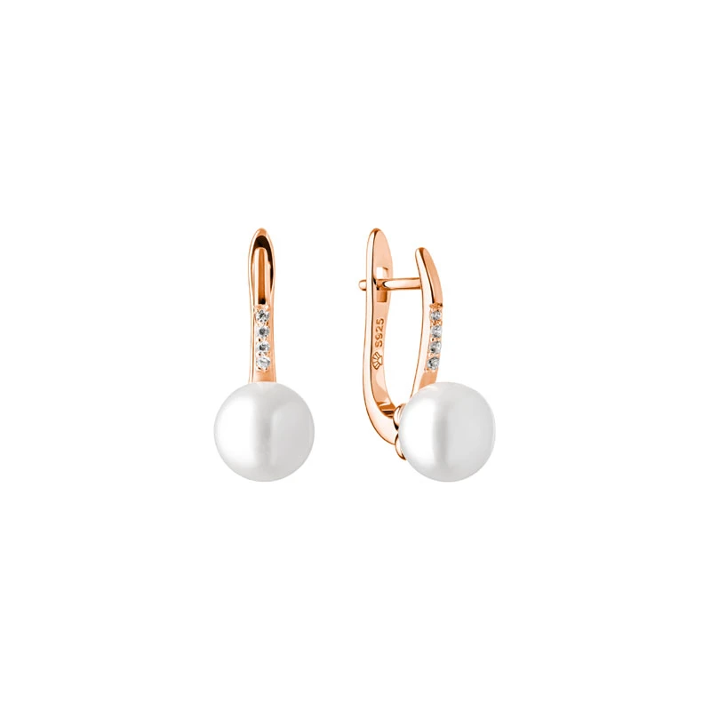 Pozlátené visiace náušnice ozdobené riečnymi perlami a žiarivými zirkónmi. Náušnice sú vyrobené zo striebra 925/1000, pozlátené 14k ružovým zlatom. Riečna perla má priemer 8 mm. Rozmer náušníc 19x8 mm. Náušnicové zapínanie je na ruský patent.