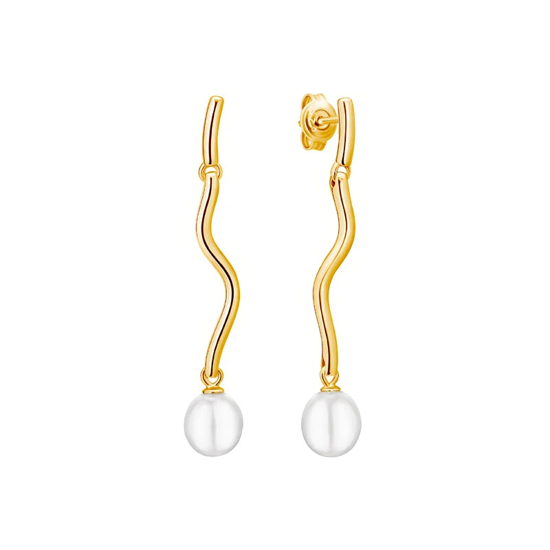 Perlové náušnice zo striebra 925/1000. Povrch náušníc je pozlátený 14K žltým zlatom. Náušnice sú ozdobené prírodnými sladkovodnými perlami. Celková dĺžka náušníc 42 mm. Náušnicové zapínanie je na puzety.