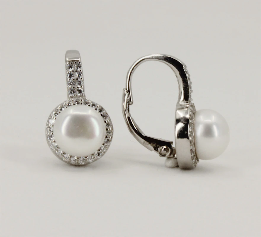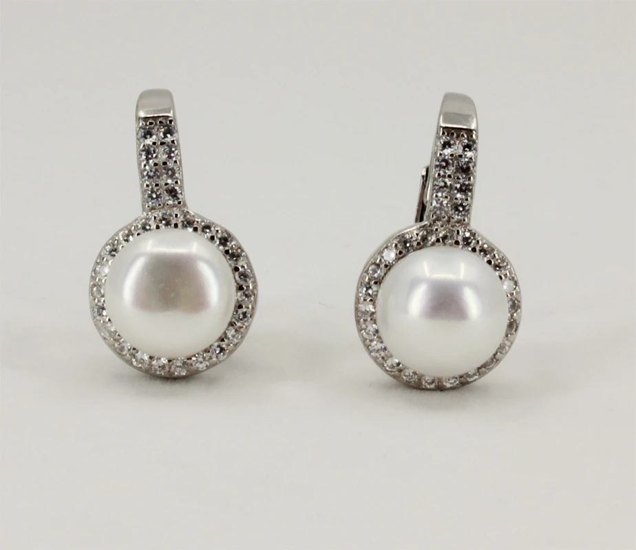 Strieborné visiace náušnice s perlami a zirkónmi. Náušnice sú vyrobené zo striebra rýdzosti 925/1000 a osadené sú prírodnými perlami a prvotriednymi zirkónmi. Povrch náušníc je porodiovaný. Nanesené rodium dodáva náušniciam jasnú farbu s leskom, a súčasne zaisťuje dlhodobý bezchybný vzhľad náušníc. Náušnicové zapínanie je na klapku. Rozmery náušnice 17x14x10mm.