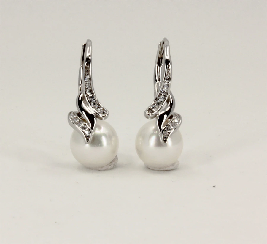 Strieborné visiace náušnice s perlami a zirkónmi. Náušnice sú vyrobené zo striebra rýdzosti 925/1000 a osadené sú prírodnými perlami a prvotriednymi zirkónmi. Povrch náušníc je porodiovaný. Nanesené rodium dodáva náušniciam jasnú farbu s leskom, a súčasne zaisťuje dlhodobý bezchybný vzhľad náušníc. Náušnicové zapínanie je na klapku. Rozmery náušnice 24x11x8mm.