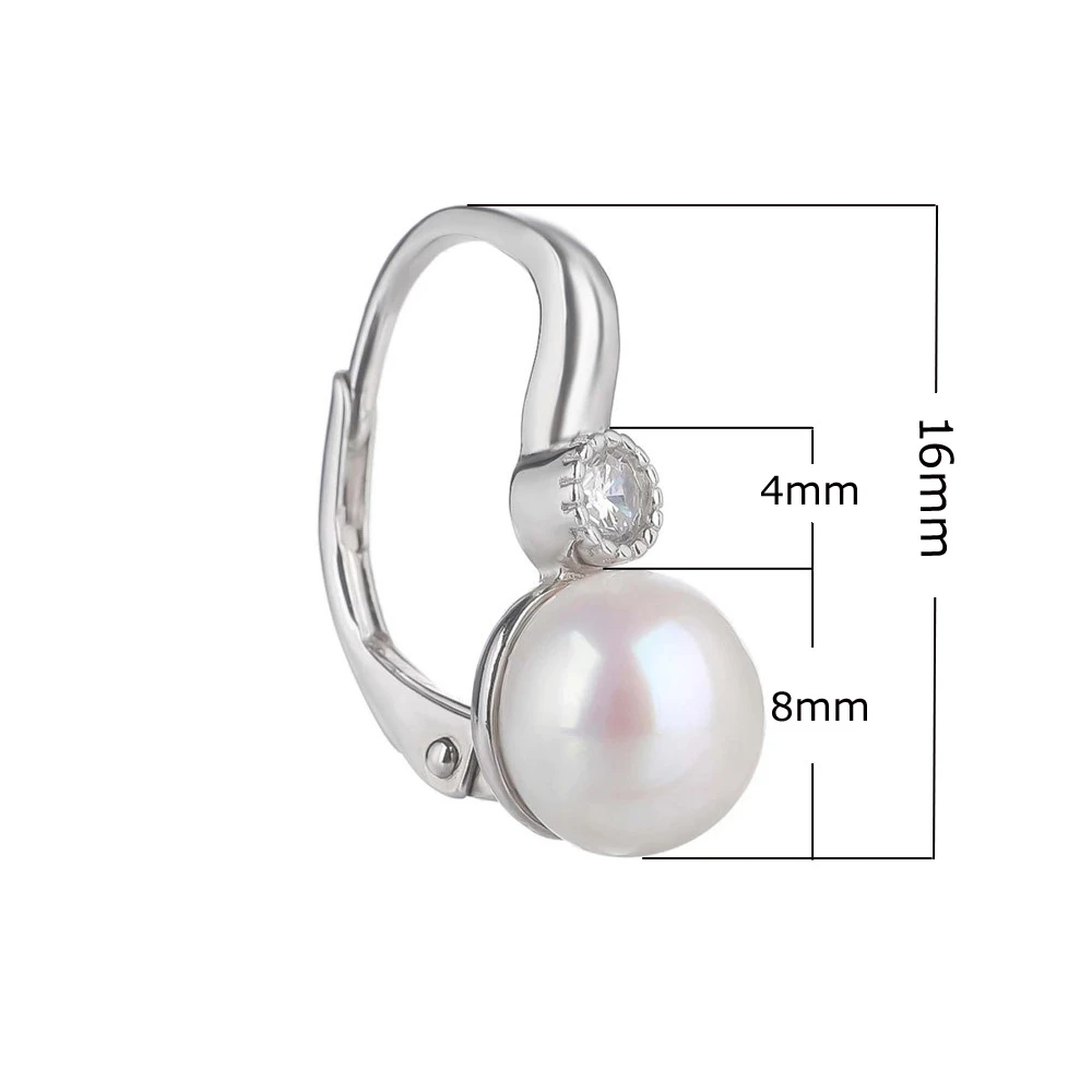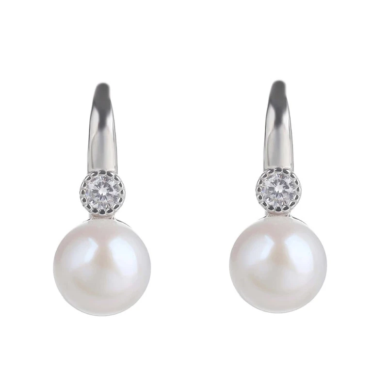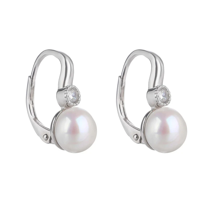 Strieborné visiace náušnice s perlami a zirkónmi. Náušnice sú vyrobené zo striebra 925/1000 a sú osadené prírodnými perlami a prvotriednymi zirkónmi. Povrch náušníc je pokovovaný ródiom. Nanesené ródium dodáva náušniciam žiarivú farbu s leskom a zároveň zabezpečuje dlhotrvajúci bezchybný vzhľad náušníc. Zapínanie náušníc je na klapku Rozmery náušníc 16x8x4 mm nájdete na sprievodnej fotografii.