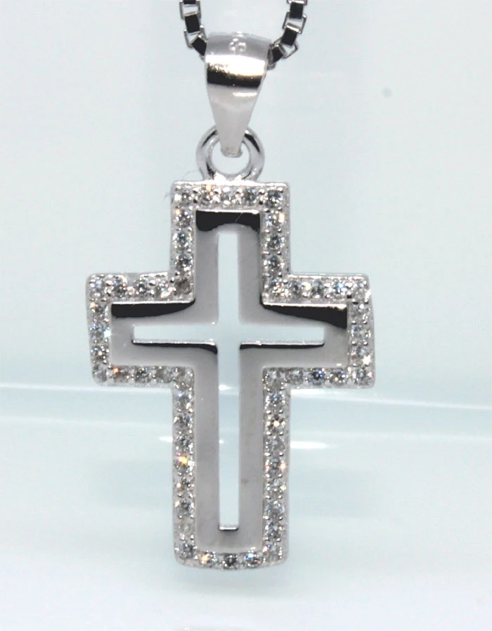 Strieborný prívesok krížik so zirkónmi. Krížik má porhodiovaný povrch, takto upravený povrch dodáva krížika jasnú farbu a lesk podčiarknutou žiarivými zirkónmi. Očkom pre zavesenie krížika možno prevliecť strieborná retiazka s priemerom do 3,0 mm. Rozmer krížiku 21x15 mm.
