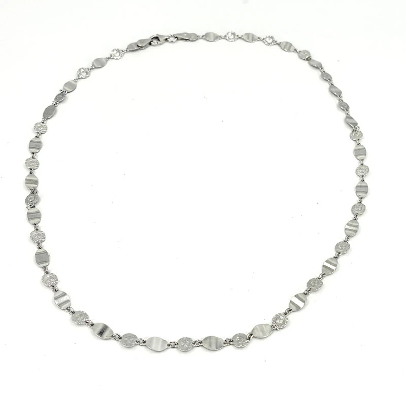 Náhrdelník zo striebra rýdzosti 925/1000. Povrch náhrdelníka je porhodiovaný. Úprava rhodiovaním dodáva náhrdelníku jasnú farbu s leskom, chráni povrch šperku proti poškriabaniu, náhrdelník tak bude mať dlhú dobu bezchybný vzhľad. Náhrdelník je široký 5mm. Náhrdelník má zapínanie na karabínku.