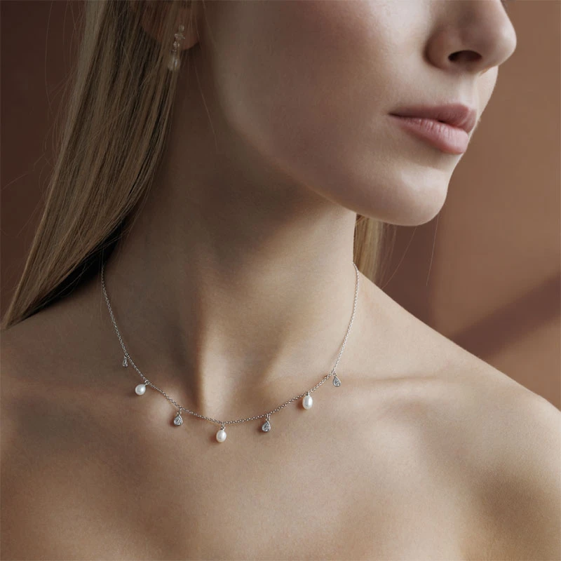 Náhrdelník zo striebra 925/1000 ozdobený sladkovodnými perlami a žiarivými zirkónmi. Náhrdelník tvorí jemná strieborná retiazka široká 1,0 mm na ktorej sú privesené perličky a zirkóny. Povrch retiazky je porhodiovaný. Úprava povrchu ródiom dodáva retiazke jasnú farbu s leskom, potláča prípadné alergické reakcie a zamedzuje prirodzenej oxidácii striebra. Sladkovodné perličky majú priemer 5 mm, zirkóny v tvare slzy sú široké 4 mm. Náhrdelník je možné zapnúť na úrovni dĺžok 38,40,42,44,47cm