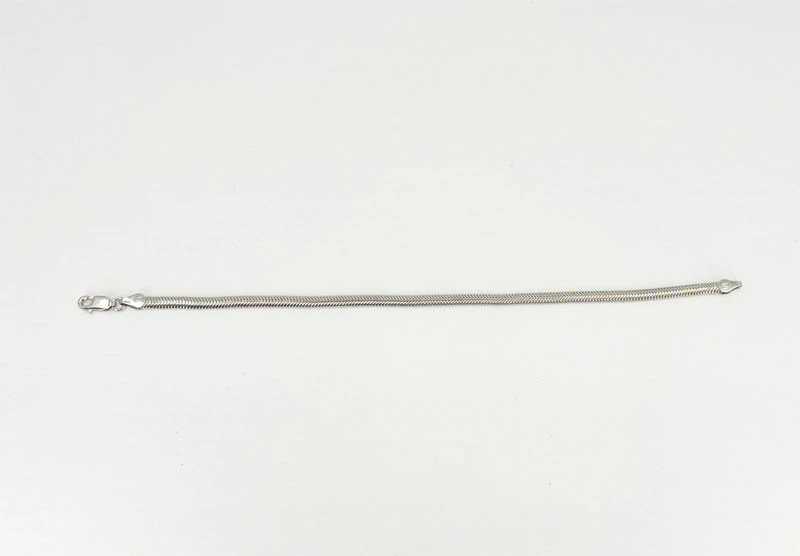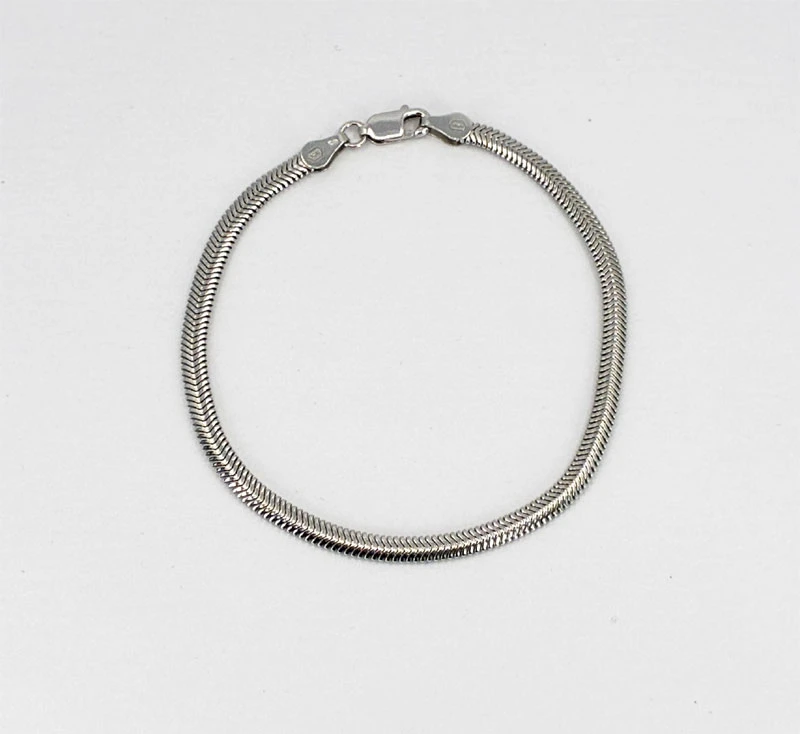 Strieborný náramok typu hádok. Náramok je vyrobený zo striebra 925/1000. Povrch náramku je porhodiovaný. Nanesené ródium dodáva šperku jasnú baru s leskom, zvyšuje odolnosť náramku proti poškriabaniu a zabezpečuje dlhodobý bezchybný vzhľad šperku. Náramok je dlhý 18 cm, šírka náramku 4 mm, zapínanie náramku je karabínové.