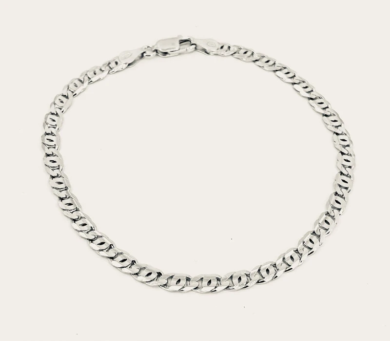 Náramok na ruku vyrobený z kvalitného striebra 925/1000 s porhodiovaným povrchom. Úprava povrchu rhodiovaním dodáva náramku jasnú farbu s leskom, potláča alergické reakcie a chráni povrch náramku pred poškriabaním. Vďaka tejto úprave bude mať povrch náramku dlhú dobu bezchybný vzhľad a šperk môžu bez obáv nosiť aj osoby s citlivou pokožkou. Náramok je široký 4mm. Zapínanie náramku je karabínové.