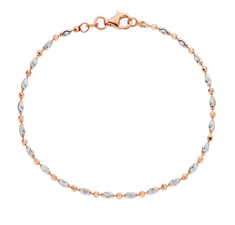 Dámsky strieborný pozlátený náramok zo striebra rýdzosti 925/1000. Náramok je pozlátený 14 K ružovým zlatom, strieborné časti náramku sú porhodiované. Úprava povrchu pozlátením a rhodiovaním dodáva šperku jasnú farbu s leskom a súčasne zaisťuje dlhodobý bezchybný vzhľad náramku. Zapínanie náramku je na karabínku. Náramok je široký 2mm.