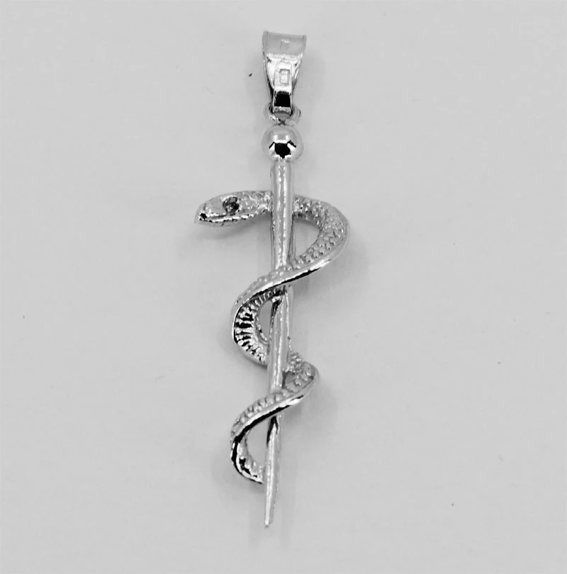 Prívesok Aeskulapova palicu zo striebra 925/000. Povrch prívesku je porhodiovaný. Úprava rhodiovaním dodáva prívesku jasnú farbu s leskom, zvyšuje odolnosť povrchu proti poškriabaniu a zamedzuje prirodzenej oxidácii striebra. Prívesok tak bude mať po dlhú dobu bezchybný vzhľad. Rozmer palice 35x10 mm. Závesným očkom na prívesku je možné prevliecť striebornú retiazku s priemerom do 3 mm.