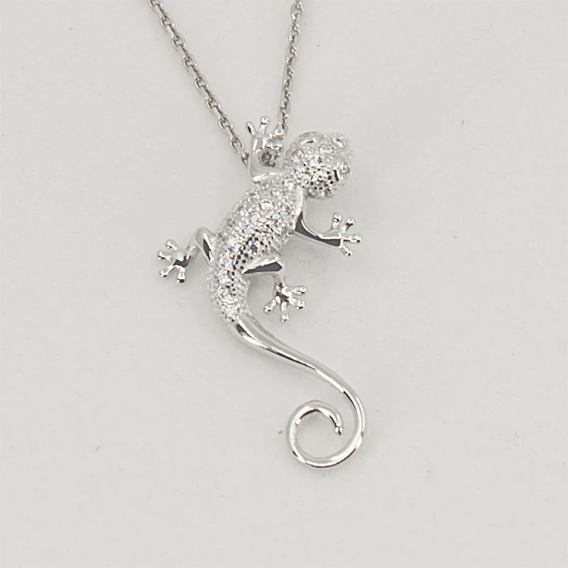 Prívesok jašterica zo striebra 925/1000. Jašterica je navyše osadená prvotriednymi zirkónmi. Povrch prívesku je porhodiovaný. Úprava rhodiovaním dodáva prívesku jasnú farbu s leskom, zvyšuje odolnosť povrchu proti poškriabaniu a zamedzuje prirodzenej oxidácii striebra. Prívesok tak bude mať po dlhú dobu bezchybný vzhľad. Rozmer jašterice 23x23 mm. Závesným očkom na prívesku je možné prevliecť striebornú retiazku s priemerom do 3 mm.