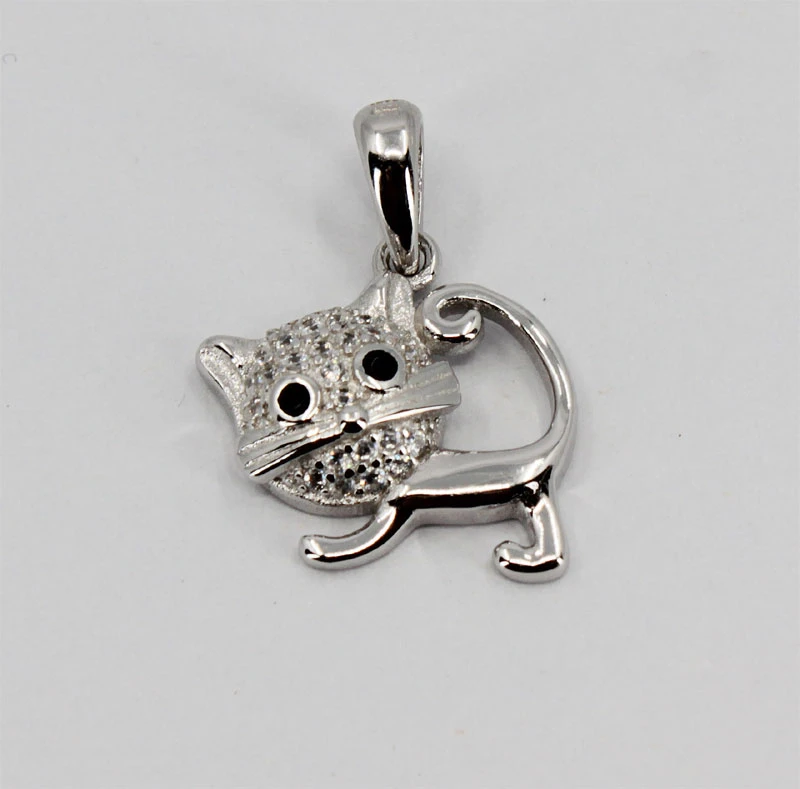 Prívesok mačka za striebra 925/1000. Mačička je navyše osadená prvotriednymi zirkónmi. Povrch prívesku je porhodiovaný. Úprava rhodiovaním dodáva prívesku jasnú farbu s leskom, zvyšuje odolnosť povrchu proti poškriabaniu a zamedzuje prirodzenej oxidácii striebra. Prívesok tak bude mať po dlhú dobu bezchybný vzhľad. Rozmer mačky 16x13 mm. Závesným očkom na prívesku je možné prevliecť striebornú retiazku s priemerom do 3 mm.
