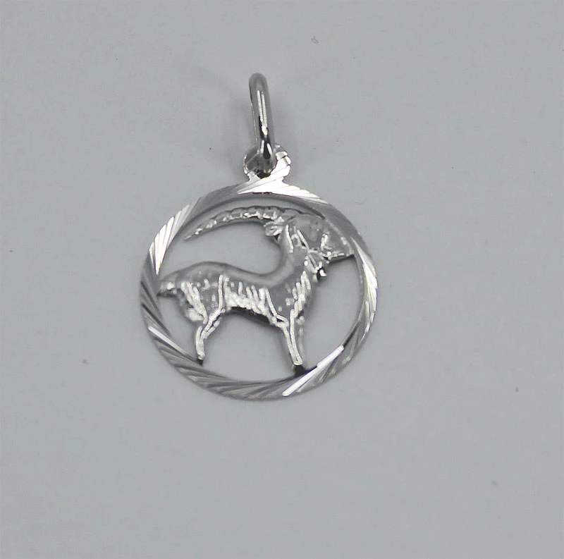 Prívesok na krk so znamením Kozorožec (22.12-20.1). Prívesok je vyrobený zo striebra 925/1000. Povrch prívesku je leštený. Prívesok má porhodiovaný povrch. Úprava povrchu rhodiovaním dodáva prívesku jasnú farbu s leskom a súčasne zamedzuje prirodzenej oxidácii striebra. Porhodiovaný povrch prívesku je tiež odolnejší voči poškriabaniu, šperk si tak uchová po dlhú dobu bezchybný vzhľad. Závesným očkom na znamenie je možné prevliecť retiazku s priemerom do 3,0mm. Celková "výška" prívesku vrátane závesného oka 22mm, priemer ozdoby s kozorožcom 15mm.