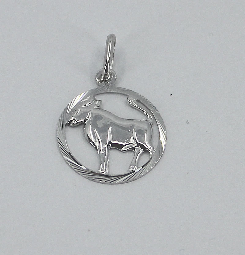 Prívesok na krk so znamením Býk (21.4 - 21.5). Prívesok je vyrobený zo striebra 925/1000. Povrch prívesku je leštený. Prívesok má porhodiovaný povrch. Úprava povrchu rhodiovania dodáva prívesku jasnú farbu s leskom a súčasne zamedzuje prirodzenej oxidácii striebra. Porhodiovaný povrch prívesku je tiež odolnejší voči poškriabaniu, šperk si tak uchová po dlhú dobu bezchybný vzhľad. Závesným očkom na znamenie je možné prevliecť retiazku s priemerom do 3,0mm. Celková "výška" prívesku vrátane závesného oka 22mm, priemer ozdoby s býkom 15mm.