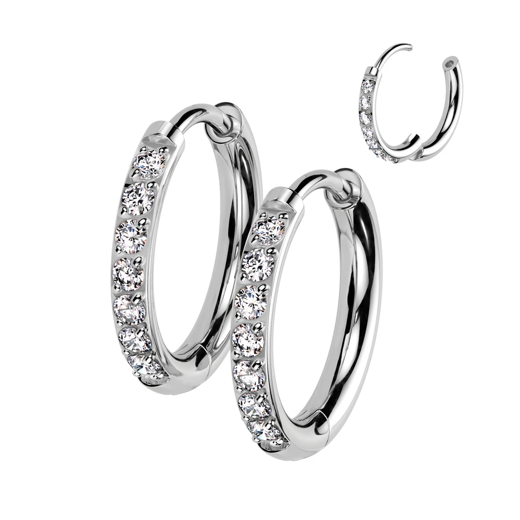 Náušnice krúžky vyrobené z titánu 6AL-4V-ELI ASTM F-136, ktorý je bežne využívaný pri výrobe telových implantátov. Povrch náušníc je leštený ozdobený prvotriednymi zirkónmi. Vnútorný priemer náušníc 10mm, vonkajší priemer náušníc 14mm. Náušnicové zapínanie je kĺbové.Uvedená cena platí za pár náušníc.