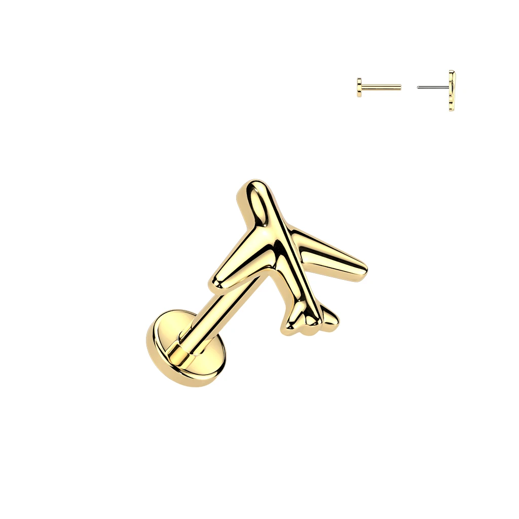Titanová náušnice s ozdobou lietadla. Náušnice je vyrobená z titánu ASTM F136, ktorý je bežne využívaný pri výrobe telových implantátov. Rozmery náušnice nájdete zobrazené na podpornej fotografii. Uvedená cena platí za 1 kus.