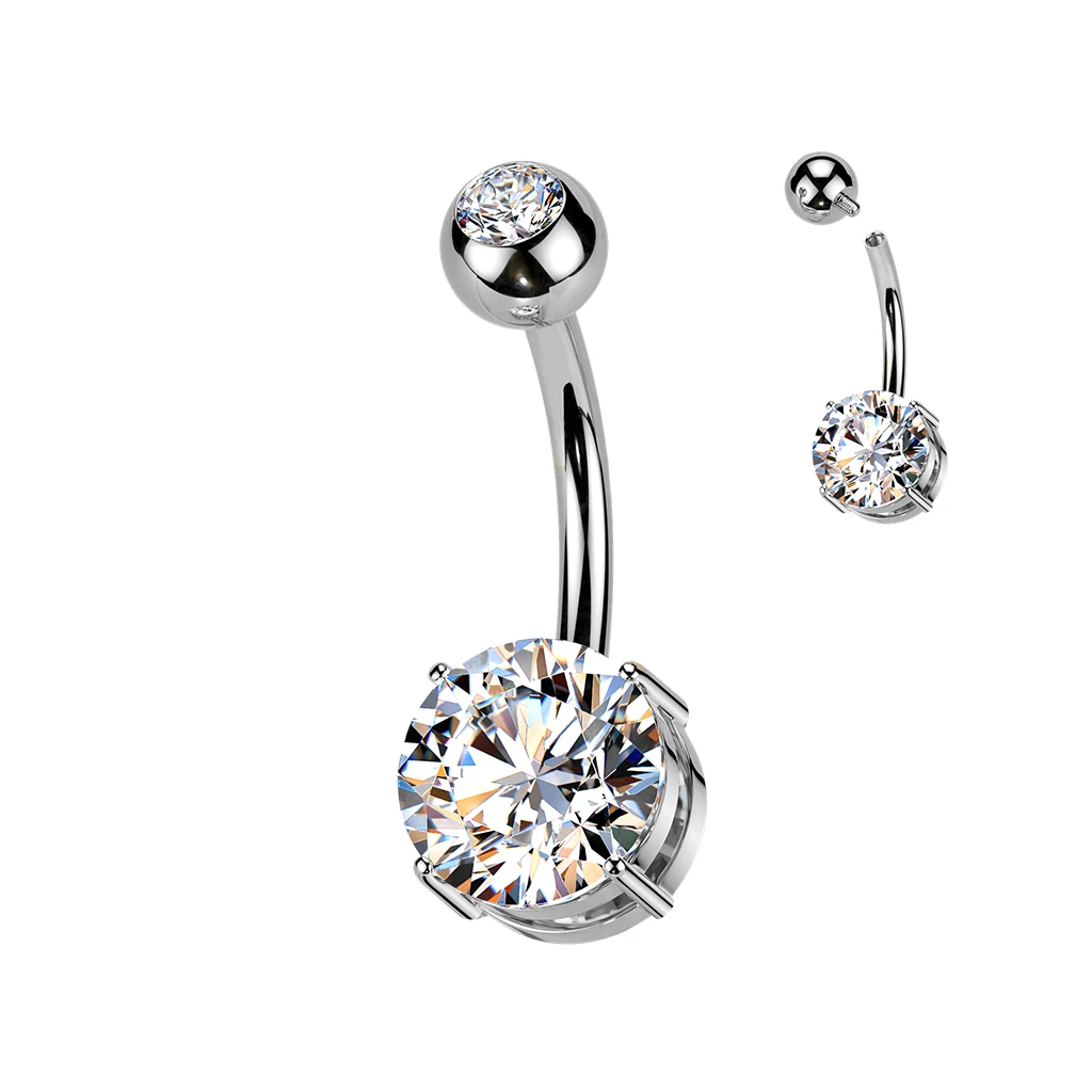 Piercing do brucha vyrobený z titánu ASTM F136, ktorý sa bežne používa pri výrobe telových implantátov. Titánový piercing do pupku s ozdobou. Driek piercingu má priemer 1,6 mm, dĺžka 10 mm. Horná skrutkovacia gulička má priemer 5 mm, spodná okrúhla ozdoba so zirkónom má priemer 8 mm.