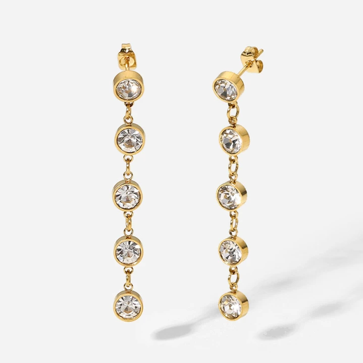 Dlhé náušnice z chirurgickej ocele ozdobené žiarivými zirkónmi. Povrch náušníc je pozlátený technológiou PVD. Žiarivé zirkóny majú priemer 6mm. Dĺžka náušníc 50mm. Náušnicové zapínanie je na puzety.
