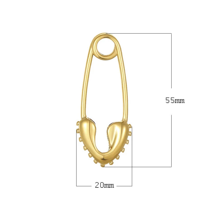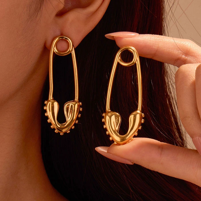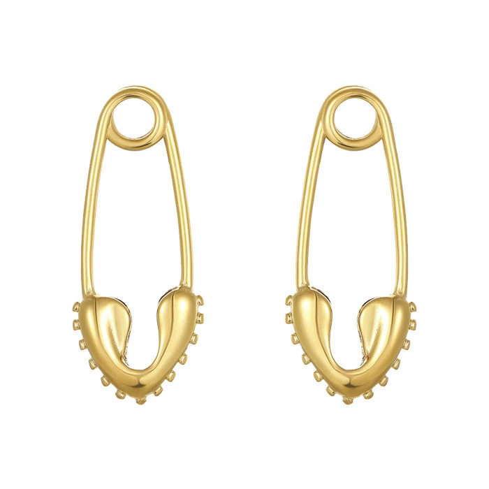 Náušnice z chirurgickej ocele napodobňujúce spínací špendlík. Povrch náušníc je pozlátený technológiou PVD. Rozmer náušníc 55x20mm. Náušnicové zapínanie je na puzety.