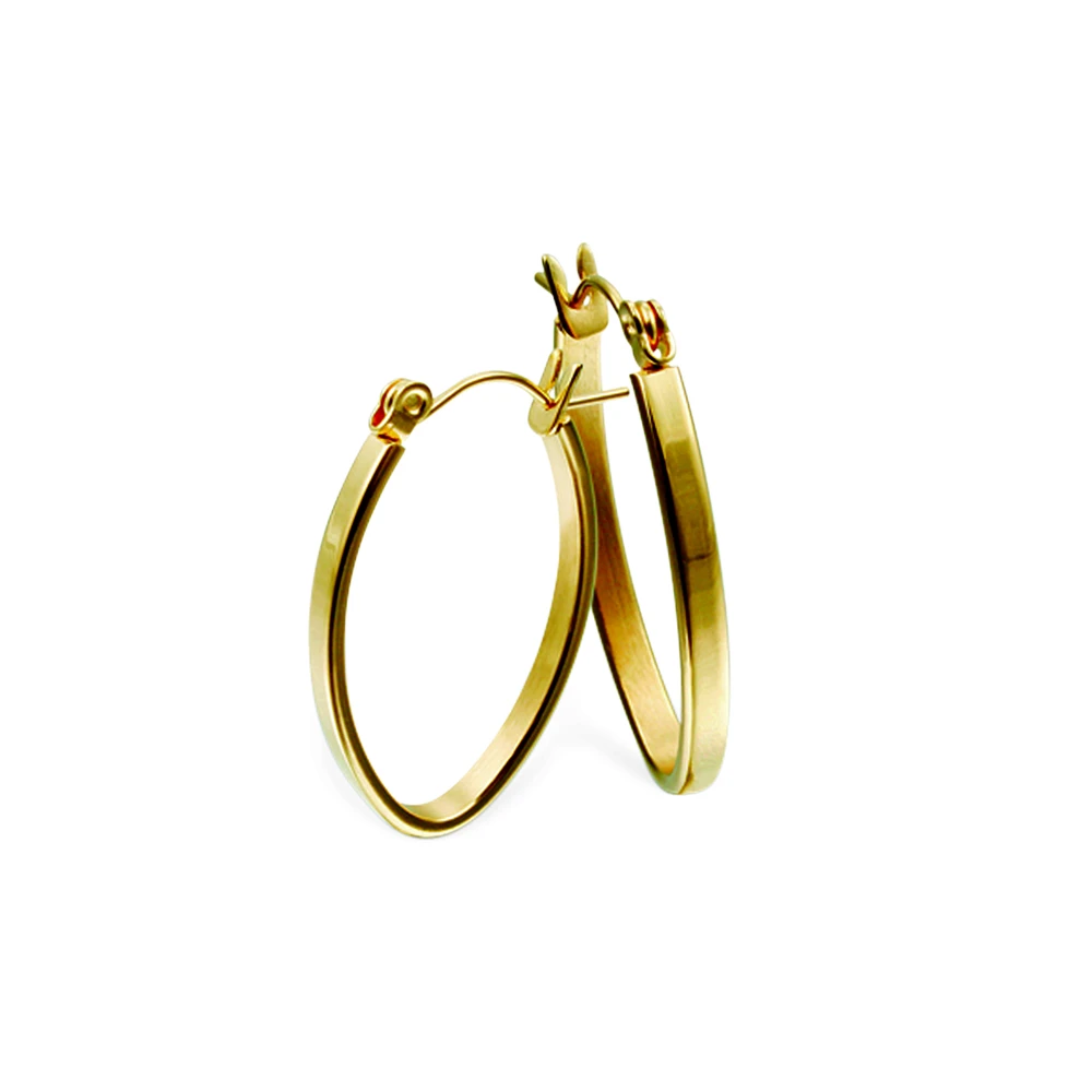 Náušnice z chirurgickej ocele visiace. Povrch náušníc je leštený pozlátený technológiou PVD. Výška náušníc 25mm, šírka 2,5mm. Náušnicové zapínanie je na francúzsky zámok.