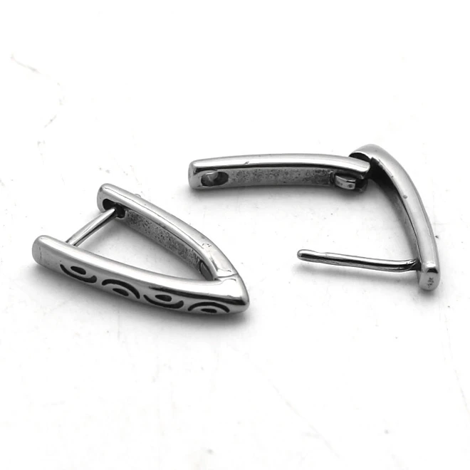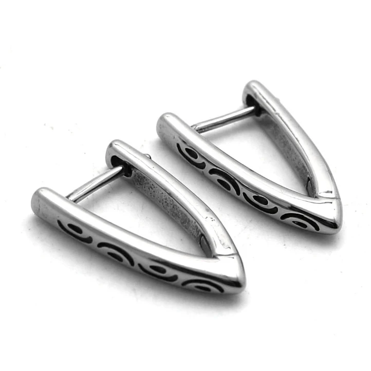 Dámske náušnice z chirurgickej ocele trojuholníkového tvaru. Náušnice majú leštený povrch so vzorom. Šírka náušníc 2,5mm. Vonkajšie rozmery náušníc 10x17mm.
