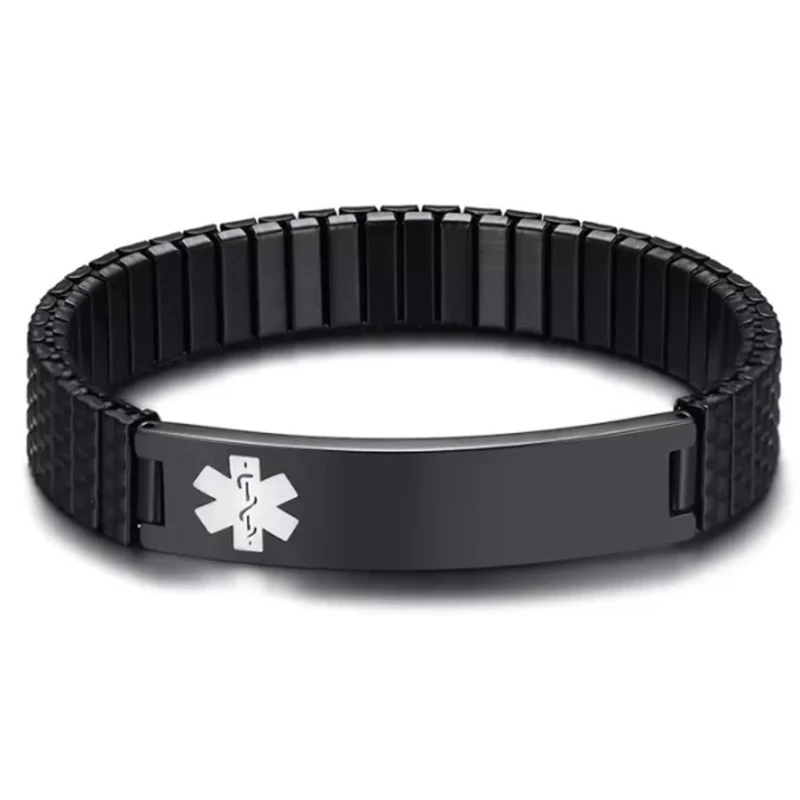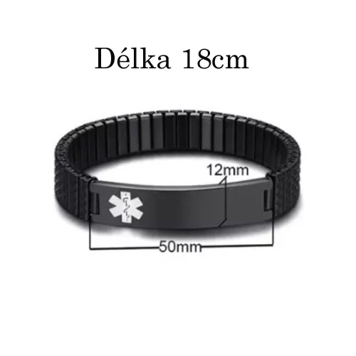 Oceľový pružný náramok, ktorý môže ochrániť Váš život, alebo život Vašich blízkych vďaka zdravotným údajom, ktoré je možné vyryť do doštičky vedľa lekárskeho symbolu.
