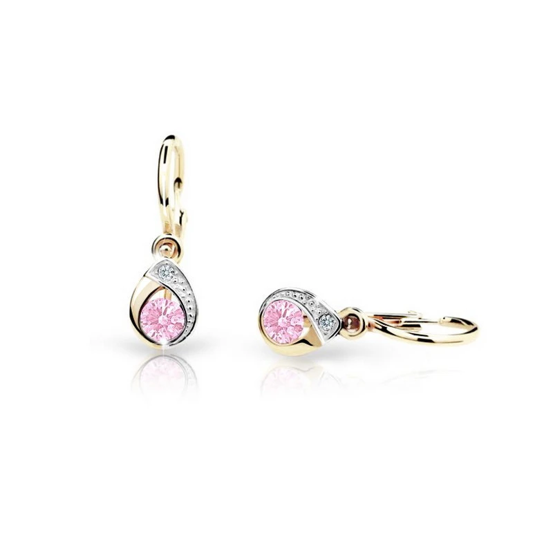 Detské náušnice zo zlata 585/000. Nádherné náušničky pre bábätká so zapínaním na detskú brizuru, ktorá deťom zabraňuje v ich jednoduchom otvorení. Luxusný vzhľad detských náušníc je podčiarknutý žiarivými kamienkami. Všetky detské šperky od Cutie Jewellery sú vyrábané Českej republike