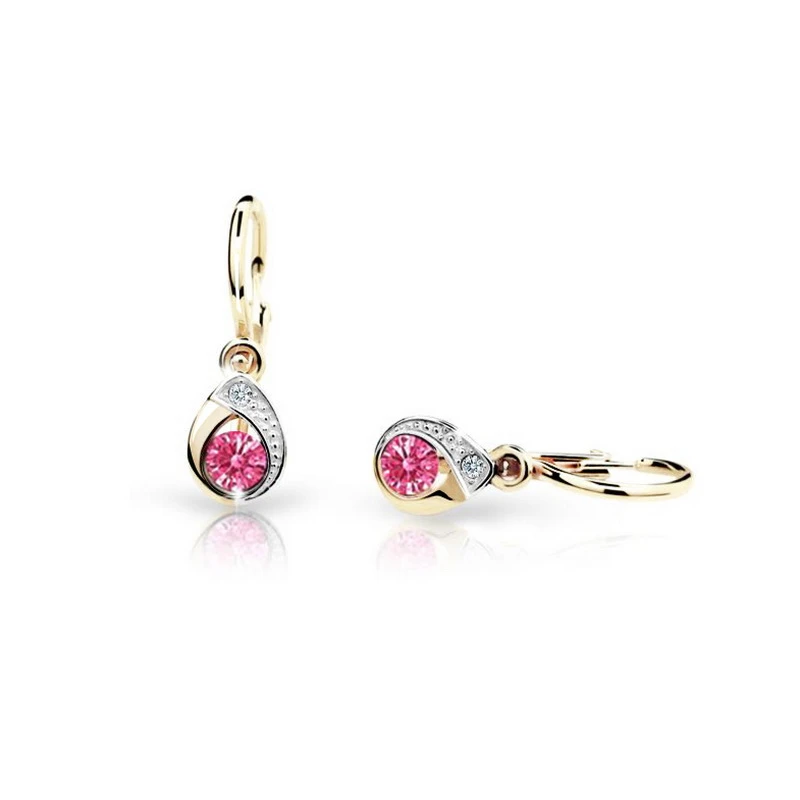 Detské náušnice zo zlata 585/000. Nádherné náušničky pre bábätká so zapínaním na detskú brizuru, ktorá deťom zabraňuje v ich jednoduchom otvorení. Luxusný vzhľad detských náušníc je podčiarknutý žiarivými kamienkami. Všetky detské šperky od Cutie Jewellery sú vyrábané Českej republike