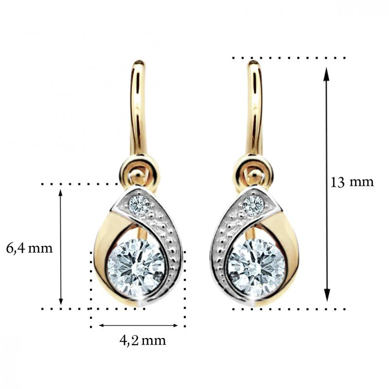 Detské náušnice zo žltého zlata 585/1000. Náušničky majú zapínanie na detskú brizúru. Toto zapínanie je skonštruované práve pre detské náušnice a zamedzuje jeho nechcenému rozovretiu a následnej strate náušničky. Rozmery náušničiek 13mm x 6,4 mm x 4,2 mm nájdete zobrazené na podpornej fotografii. Náušničky sú ozdobené žiarivými zirkónmi.
