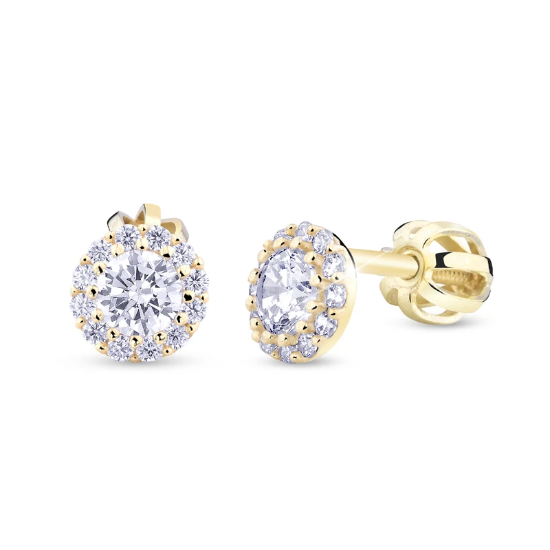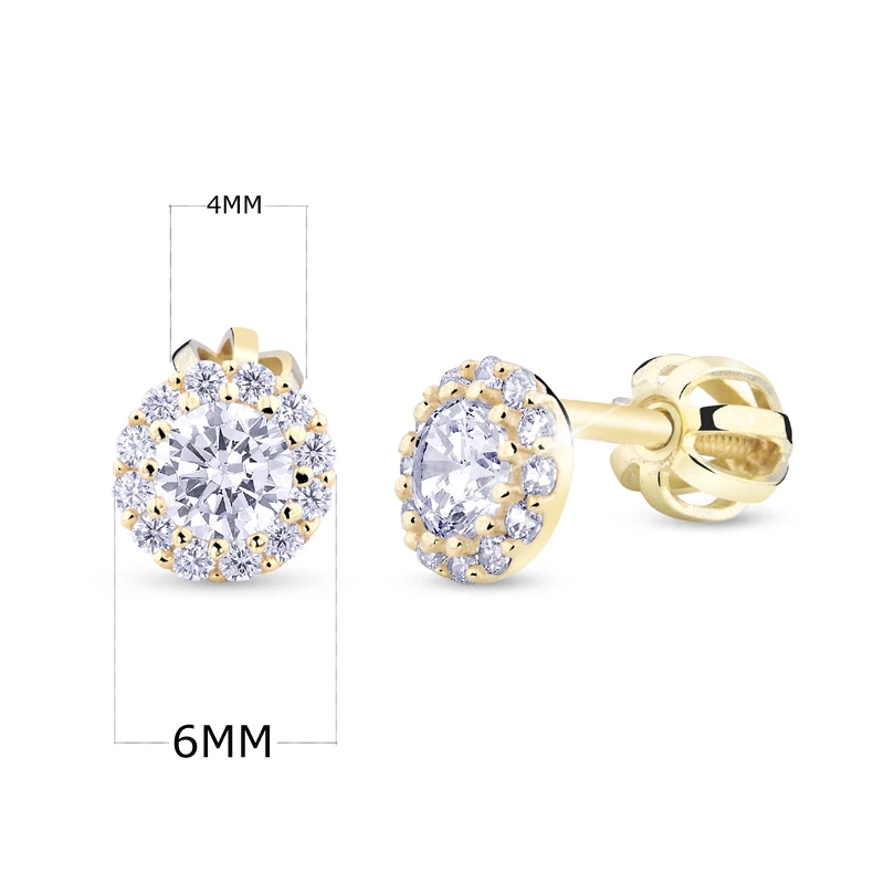 Zlaté náušnice so zirkónmi zo zlata rýdzosti 585/1000. Dámske zlaté náušnice kôstky zdobené prvotriednymi zirkónmi. Priemer ozdoby 6mm. Náušnicové zapínanie je na skrutku s priemerom 4mm. Náušnice sú samozrejme riadne označené a opuncované podľa puncového zákona.