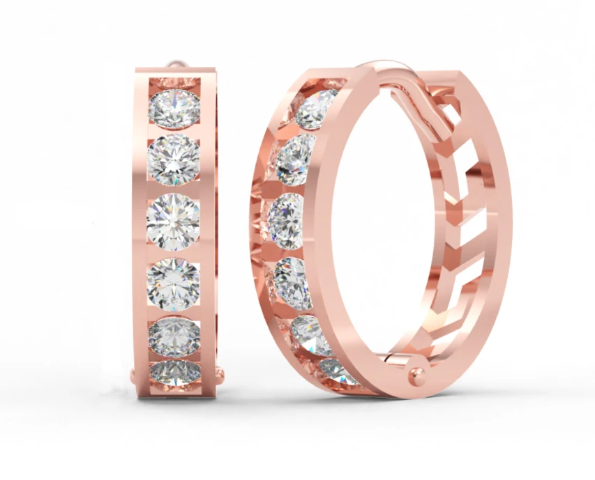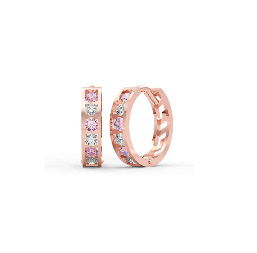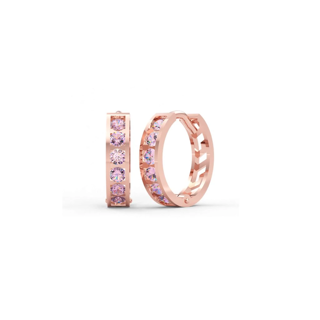 Detské náušnice z ružového zlata krúžky osadené 12ti zirkónmi. Priemer náušníc 12mm. Náušnicové zapínanie je kĺbové. Dostupné farebné varianty zirkónov nájdete na podpornom obrázku.