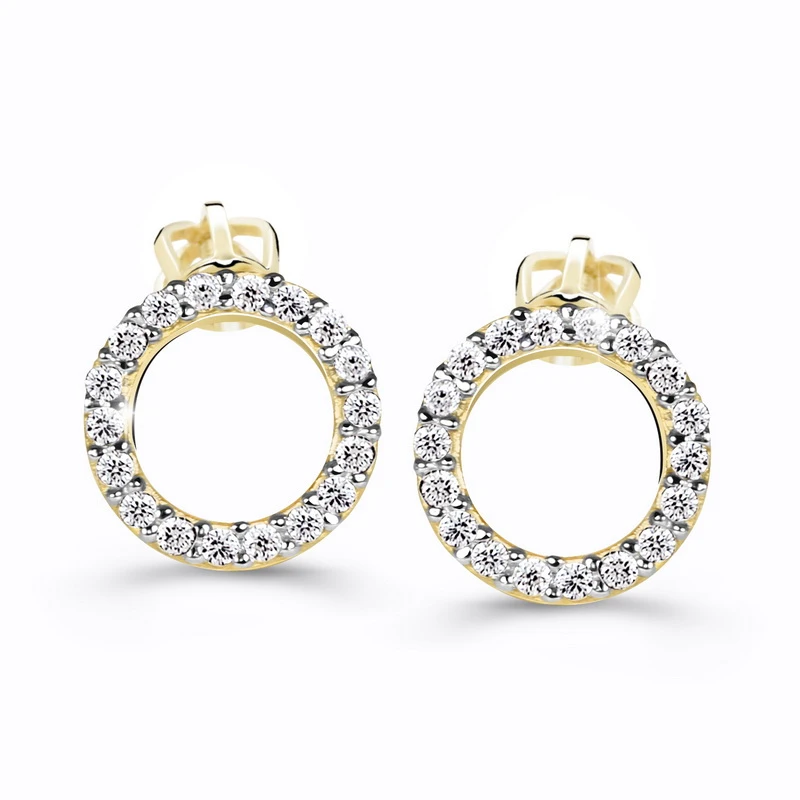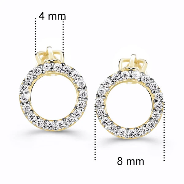 Zlaté náušnice so zirkónmi vyrobené zo žltého zlata 585/000. Priemer ozdoby náušníc 8 mm. Náušnicové zapínanie na je na skrutku. Priemer náušnicového zapínanie 4 mm.