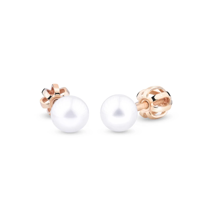 Náušnice s kultivovanou riečnou perlou z ružového zlata rýdzosti 585/1000. Osadené riečne perly sú v kvalite AAA. Perličky majú priemer 5mm. Náušnicové zapínanie je na skrutku.