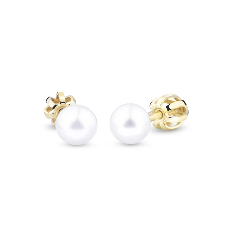 Náušnice s kultivovanou riečnou perlou zo žltého zlata rýdzosti 585/1000. Osadené riečne perly sú v kvalite AAA. Perličky majú priemer 5mm. Náušnicové zapínanie je na skrutku.