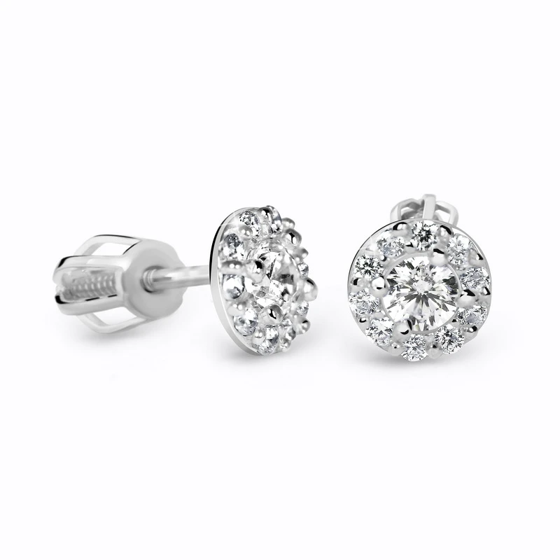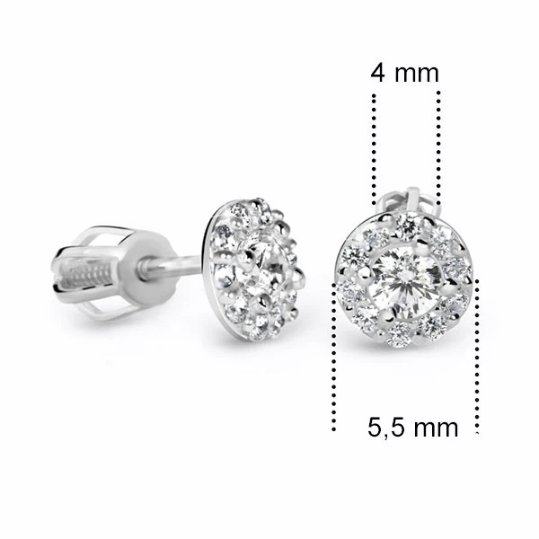Zlaté náušnice so zirkónmi vyrobené z bieleho zlata 585/000. Priemer ozdoby náušníc 5,5 mm. Náušnicové zapínanie na je na skrutku. Priemer náušnicového zapínanie 4 mm.