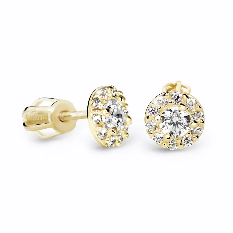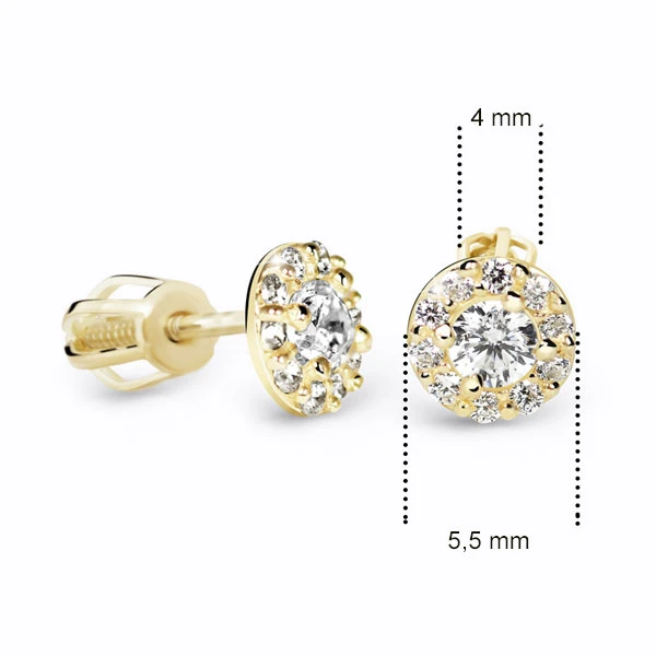 Zlaté náušnice so zirkónmi vyrobené zo žltého zlata 585/000. Priemer ozdoby náušníc 5,5 mm. Náušnicové zapínanie na je na skrutku. Priemer náušnicového zapínanie 4 mm.