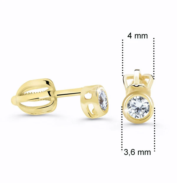 Zlaté náušnice so zirkónmi vyrobené zo žltého zlata 585/000. Priemer ozdoby náušníc 3,6 mm. Náušnicové zapínanie na je na skrutku. Priemer náušnicového zapínanie 4 mm.