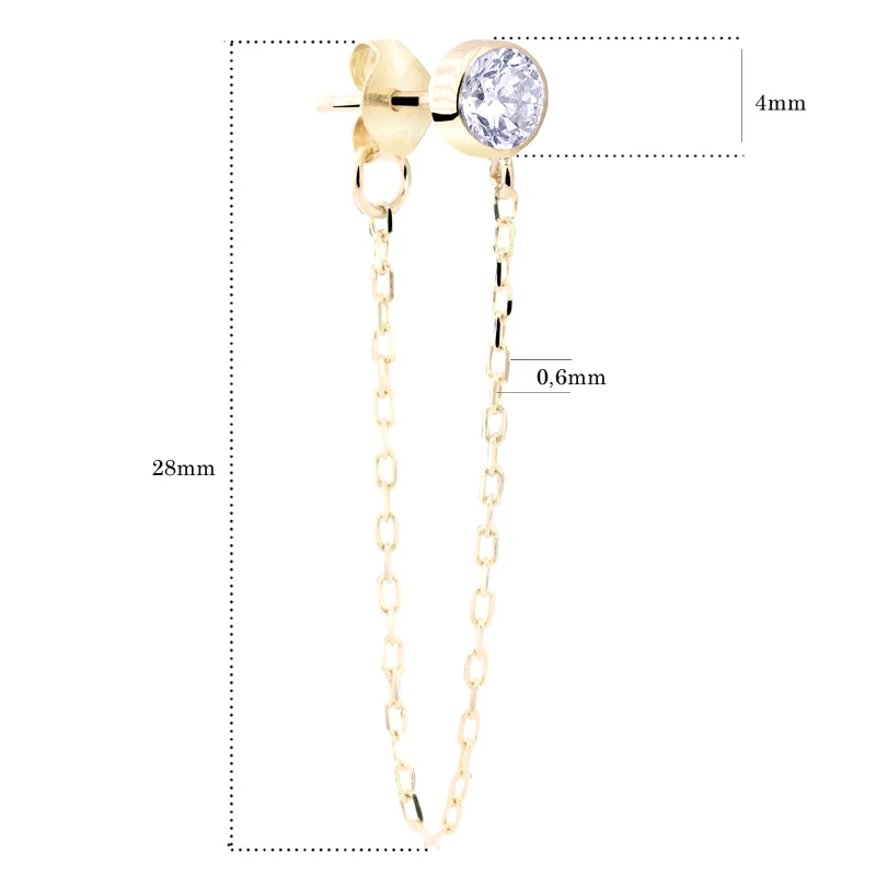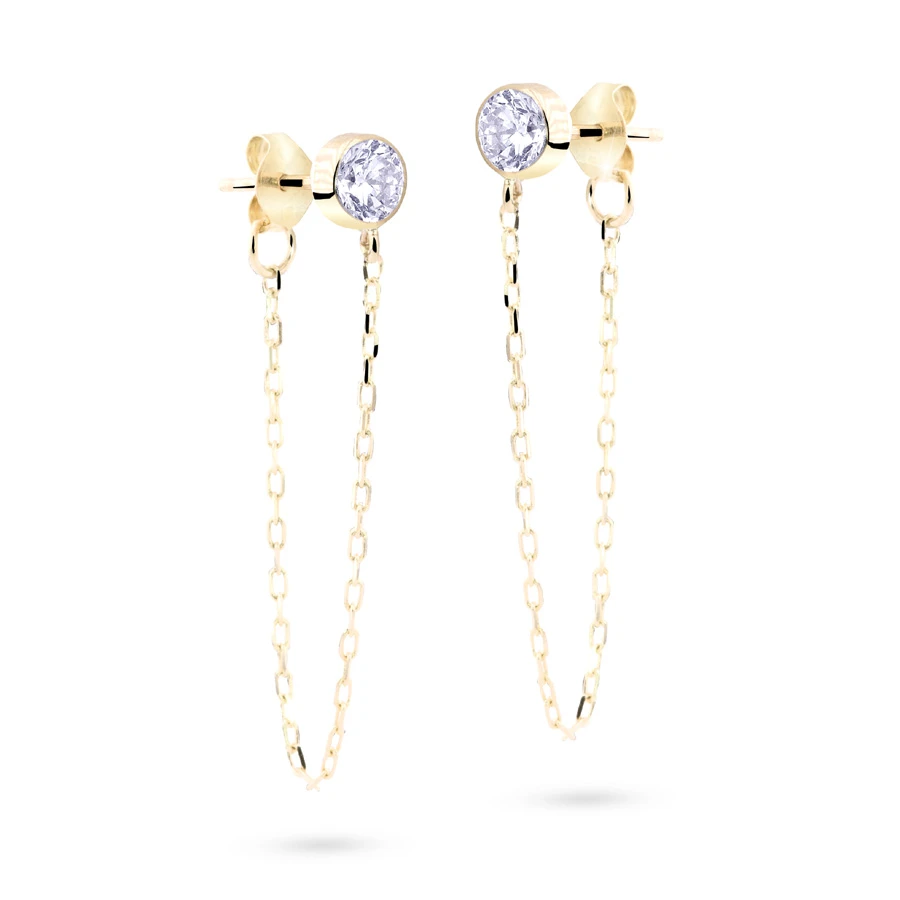 Zlaté visiace náušnice so zirkónmi. Dlhé náušnice s retiazkou, na ktorej je pripevnené náušnicové zapínanie a nehrozí tak jeho nechcená strata. Priemer ozdoby so zirkónom 4mm, dĺžka náušnice 28mm. Náušnicové zapínanie je na puzetky.